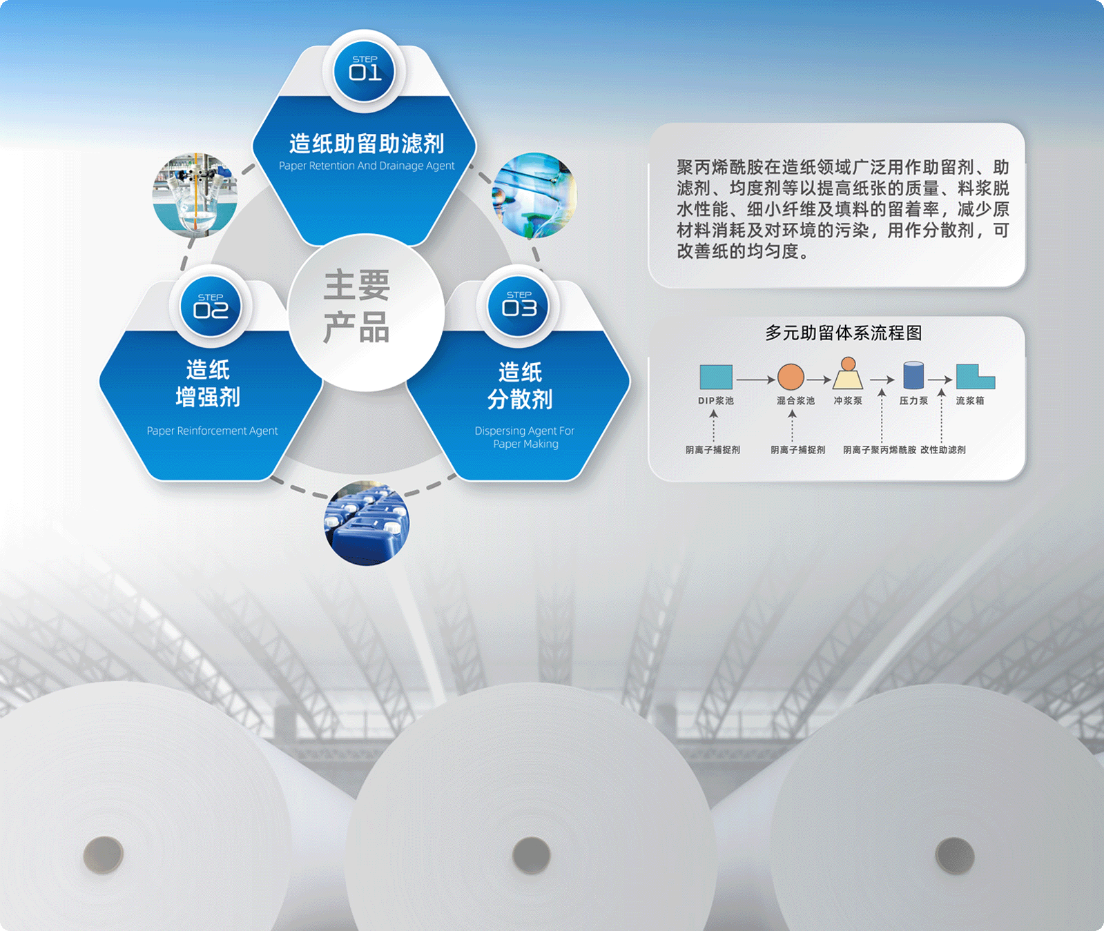 广泛用于各种文化用纸、包装纸板、生活用纸、特种纸等造纸过程。主要目的是提高细小纤维、填料(如碳酸钙、滑石粉、高岭土等)和胶料在纸页中的留着率,减少流失,降低生产成本和废水负荷;同时改善纸机网部的滤水性能,提高脱水速度,从而提升纸机车速,降低干燥能耗,改善纸页成形。