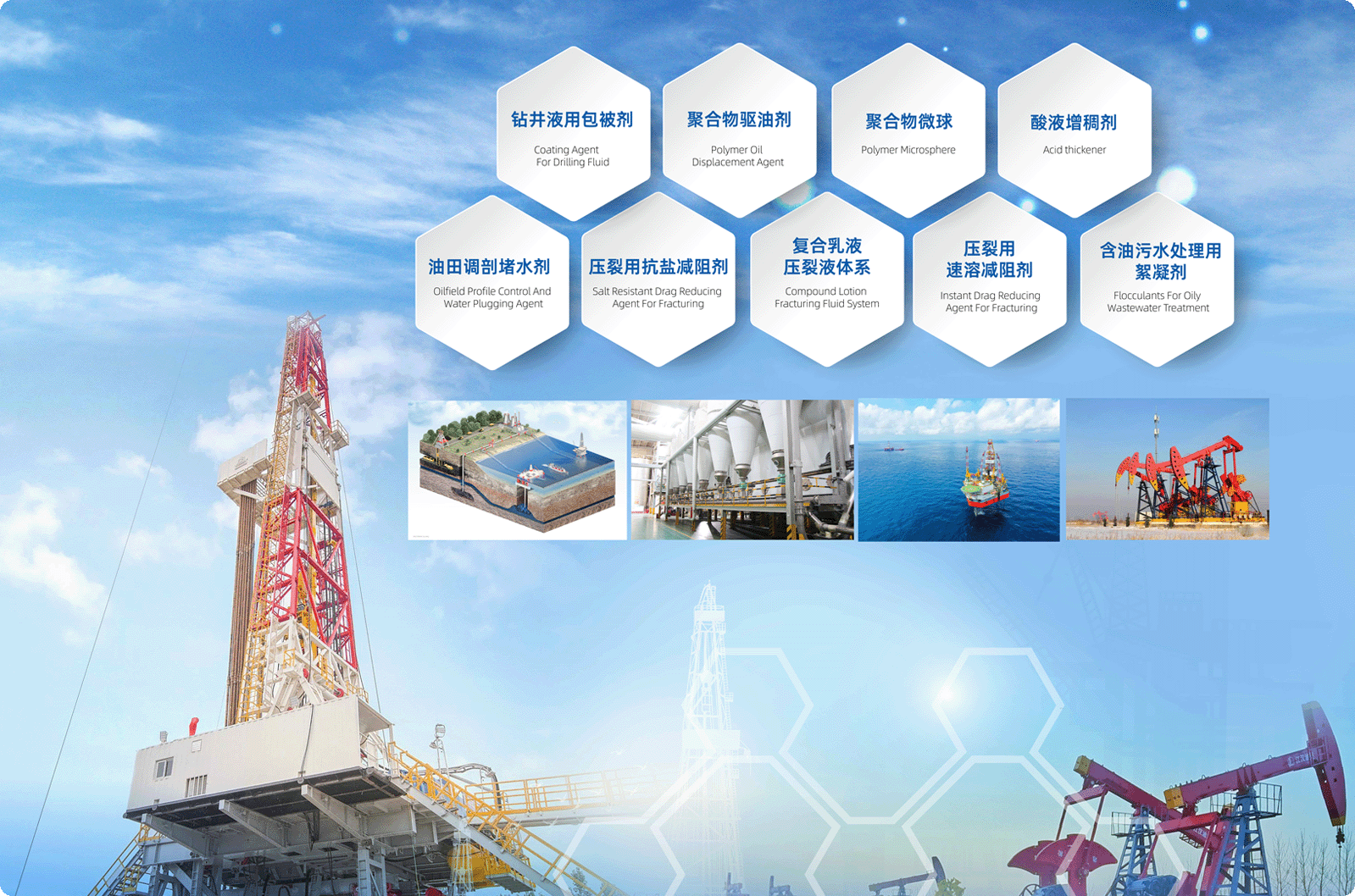 油气井水力压裂是指利用液体传压的原理,在地面用高压设备将具有粘度的压裂液以大于油层所能吸收的能力向油层注入,使井筒压力逐渐增高超过地层破裂压力时,油层就会形成一条或几条水平的或是垂直的裂缝,是目前国内外油气井增产、注水井增注的一项重要技术措施。压裂液减阻增稠材料也从早期的胍胶体系逐步过渡到高分子聚合物产品,我公司研发并生产了适合常规直井和大规模大排量水平井压裂的多种系列产品,可广泛适用于地下水、江河湖水、返排液、海水、高矿化度水等多种水质。